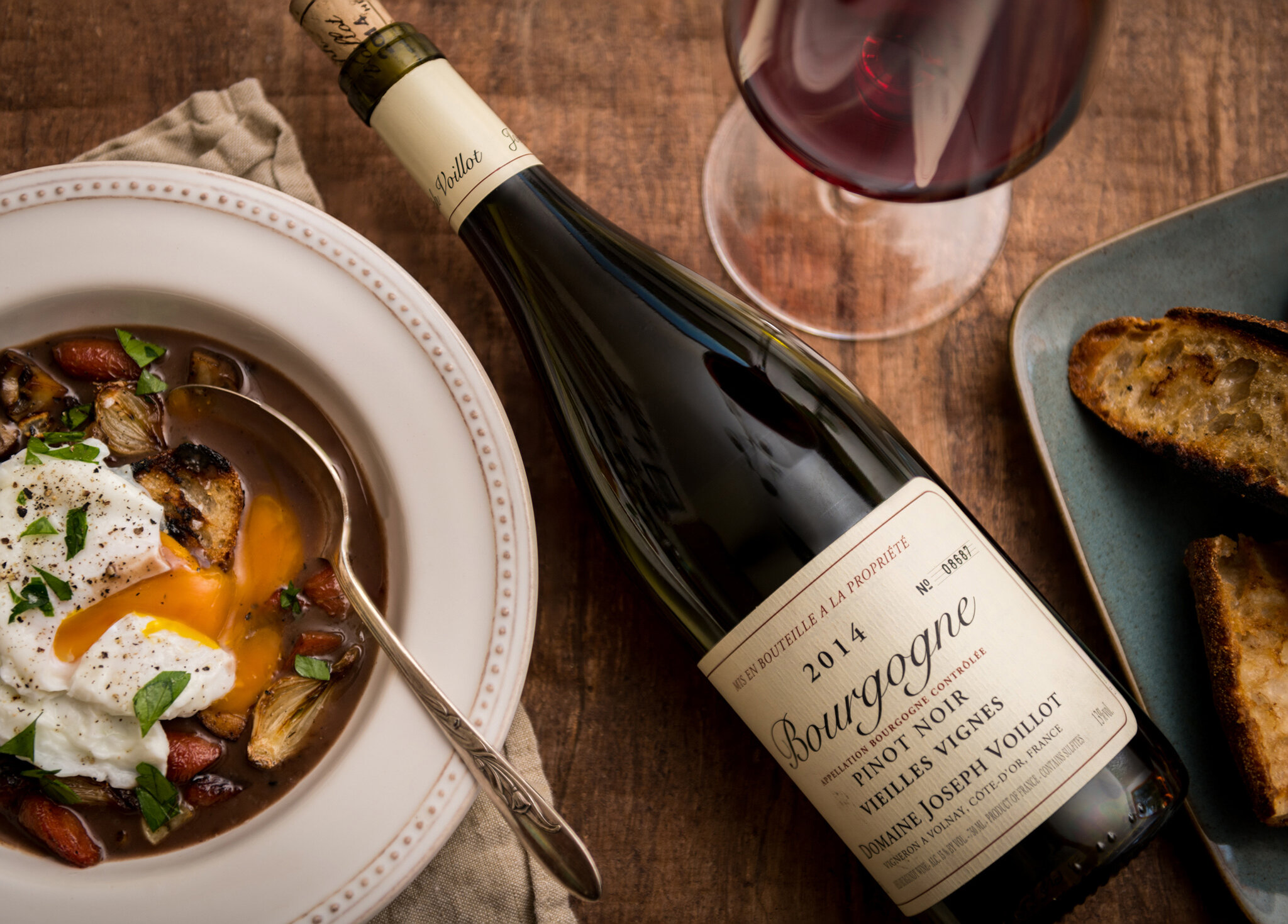 In the spirit of the Burgundy, France : Oeufs en meurette : Bacon, carrots, pearl onions, mushrooms, half a bottle of red Burgundy, homemade chicken stock, poached egg, crusty bread : Paired with 2014 Domaine Joseph Voillot Bourgogne Rouge VV